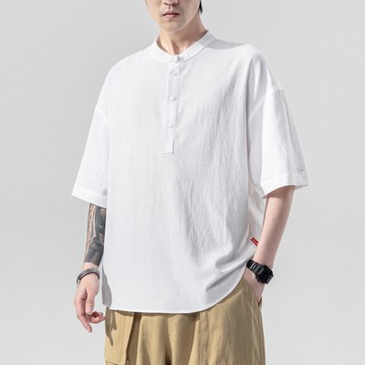 【メンズ綿麻半袖Tシャツ】綿麻素材、通気性抜群で着心地良く、レトロな雰囲気を漂わせる一着